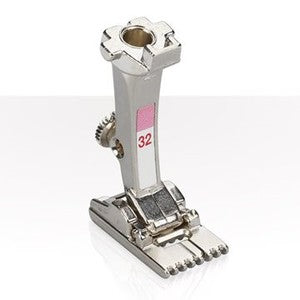 7-Groove pintuck foot # 32 is a specialist for sewing especially fine pintucks on light to medium weight fabrics using a double needle. The typical pintuck shape is produced by the bobbin thread, which pulls together the two lines of stitching as you sew.