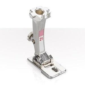 Braiding foot # 21’s beveled hole for cords and yarns up to 3 mm in diameter ensures neat, even couching. The result: high-quality, attractive sewing projects.