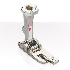 A scroll on the foot feeds the fabric edge from the front and turns it under twice, all in one operation. This produces a narrow, sturdy hem, which in combination with the corresponding stitch type creates the popular scalloped (or shell) hem. Roll and shell hemmer foot # 68 is equipped with a 2 mm wide guide.