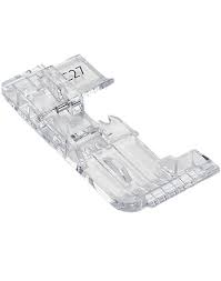 The transparent foot offers good view to the stitching area for precise guiding of fabric, for example when sewing circles and the last stitches need to meet the first stitches. It is ideal if sewing lines are marked, e.g. for decorative cover- or chainstitches in the fabric. Tapes of up to 14 mm can be sewn onto the fabric or at the fabric edge.