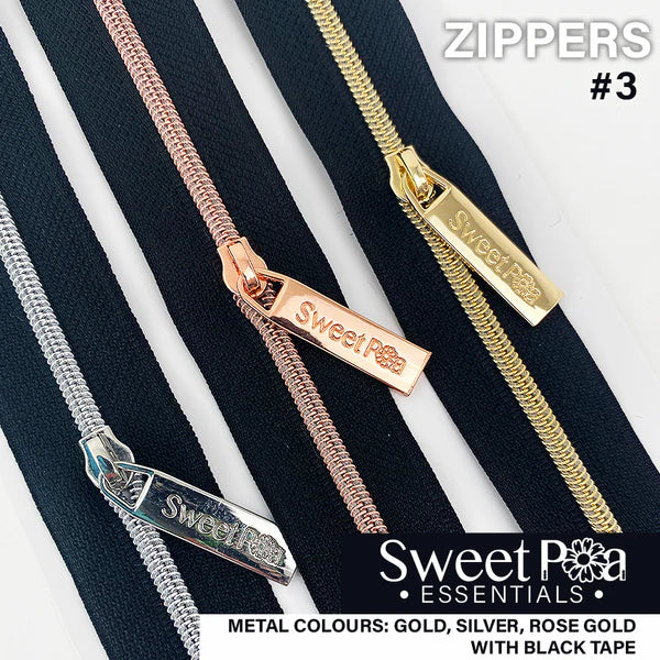 Sweet Pea Essentials Zippers are a high quality size #3 Metallic look Nylon Teeth with metal pulls. The Metallic look Nylon Teeth allow you to cut through or sew over the teeth, while keeping the look of metal. These are size #3 which are suitable to use in machine embroidery projects as well as all your sewing projects.