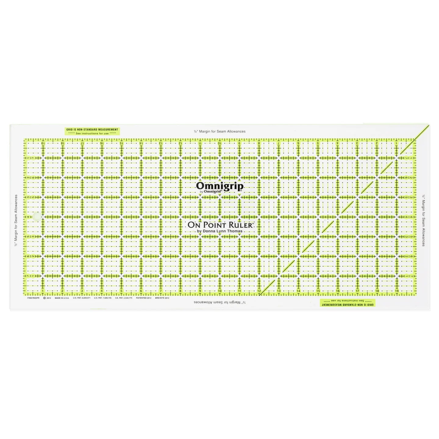 The Omnigrip On Point Ruler is an innovative cutting tool used to create squares, rectangles or triangles that will be set on point when quilting. It creates cut pieces that will measure evenly across their diagonals instead of from side-to-side.